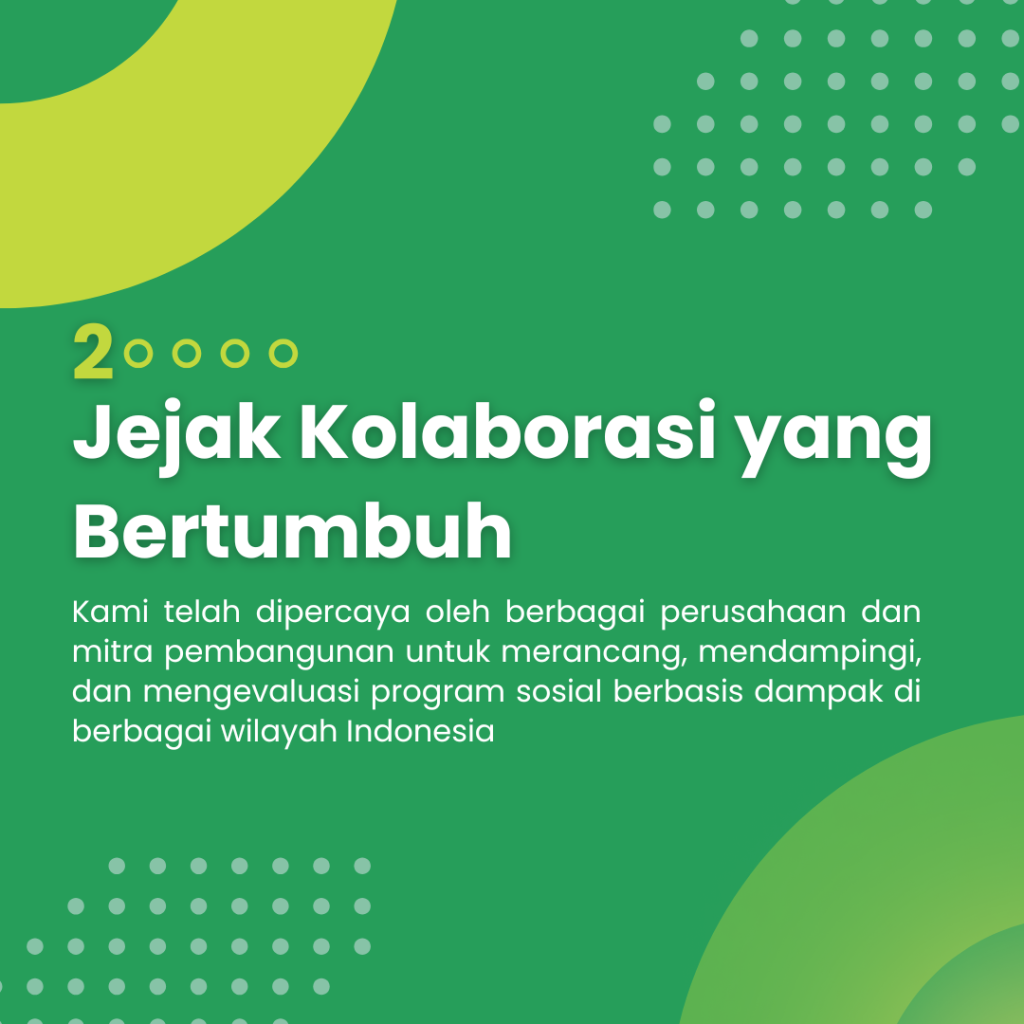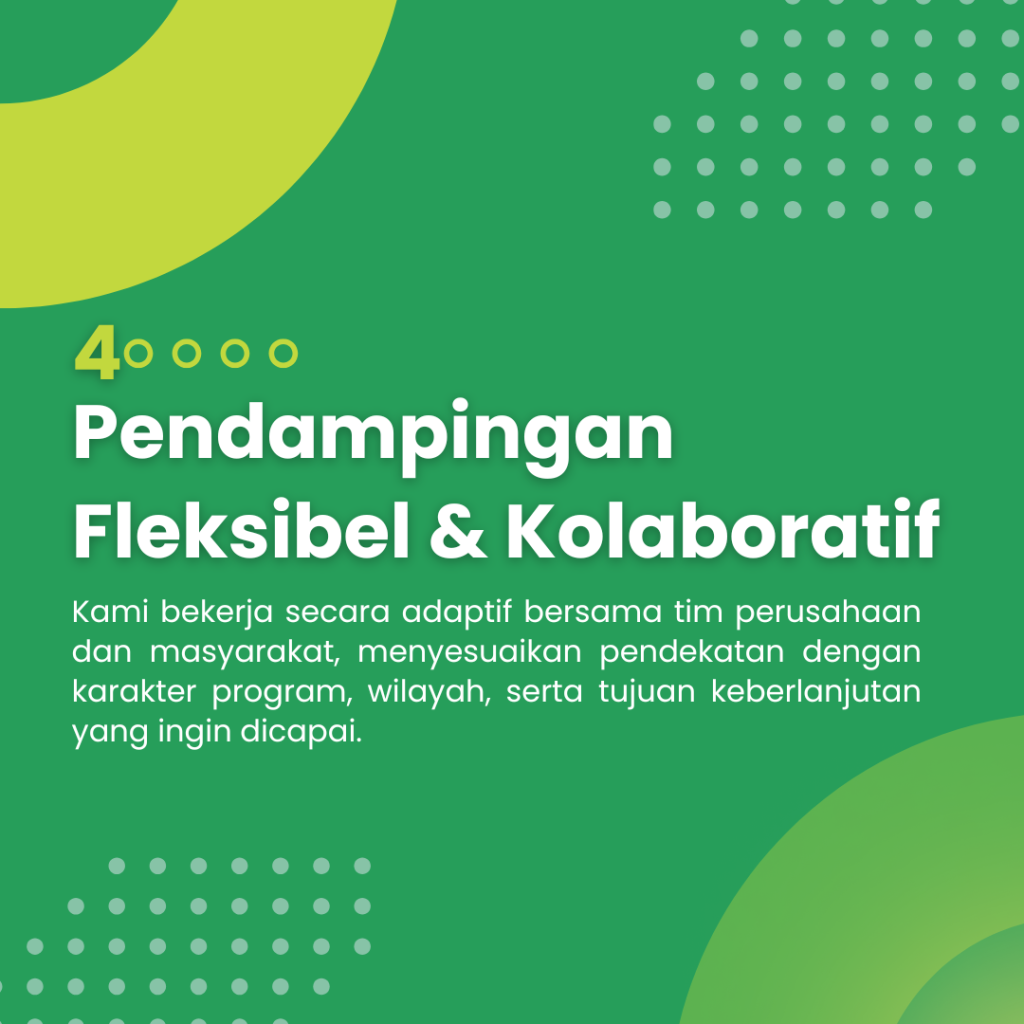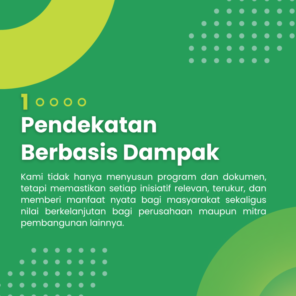 Bagi kami, tanggung jawab sosial tidak berhenti pada pelaporan atau pemenuhan regulasi. Ia hidup dalam cerita masyarakat yang bertumbuh, kelembagaan yang menguat, serta praktik bisnis yang semakin selaras dengan nilai kemanusiaan dan keberlanjutan. Melalui pendekatan berbasis data, riset mendalam, serta pendampingan yang empatik dan kolaboratif dengan mendengarkan komunitas serta memahami konteks lokal, kami menjembatani dunia industri dengan realitas sosial, agar setiap keputusan dan program yang lahir benar-benar relevan, berkeadilan, dan memberi manfaat jangka panjang.